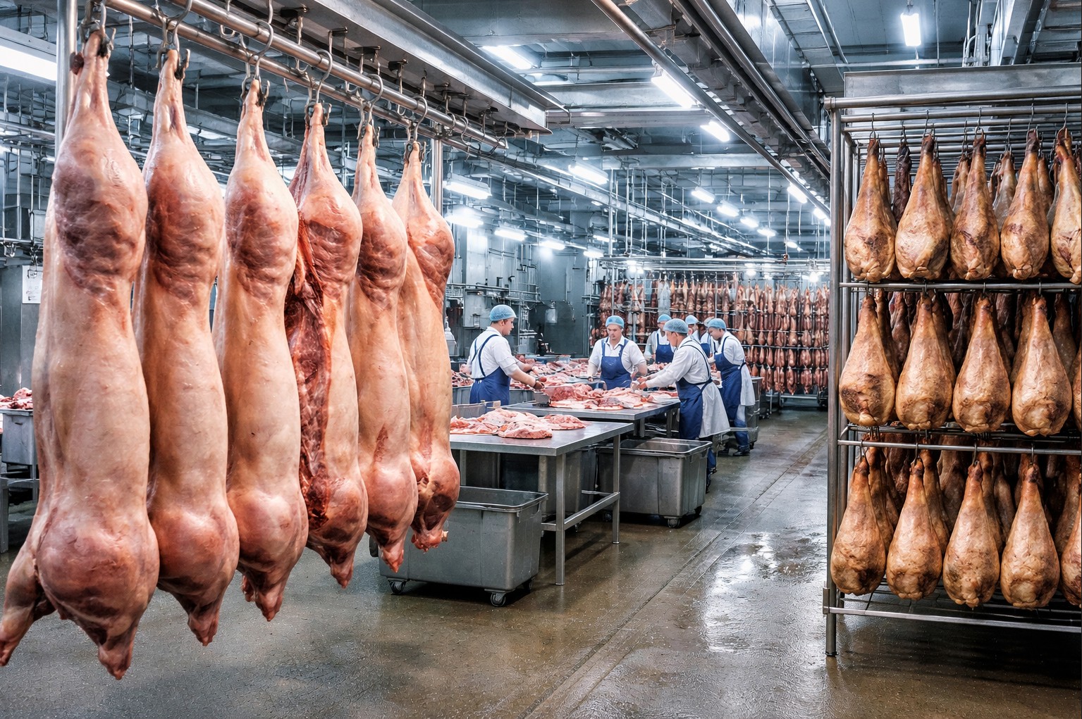 The industrial facilities are in good condition and fully equipped for the operation. The site includes slaughter rooms for different species, cold storage chambers, cutting and deboning areas, overhead rail transport systems, an on-site wastewater treatment plant, loading and unloading docks for trucks, and ample outdoor areas for heavy vehicle manoeuvring. The curing facility has significant capacity for hams, with dedicated drying and post-drying rooms. The sausage production unit is equipped with specialised machinery for cooking, mixing, filling, tying and controlled drying. In addition, there are adjoining facilities used for sheep and goat fattening.